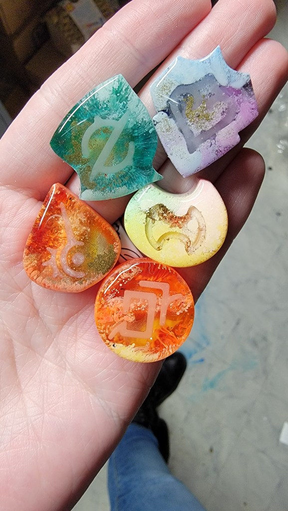 Sorin also emphasized the importance of proper equipment, or risk having a stone fail. AB resin requires a 1:1 ratio, and “warmed before it’s mixed, because then it just becomes a thick, bubbly mess.” UV resin, however, is no less finicky: “The mold you’re using MUST be platinum-cure silicone or you’re going to have a lot of struggles getting it to cure at all. It also doesn’t like liquid dye much and can do anything from just wind up being soup and never curing properly to curing a very strange color.”