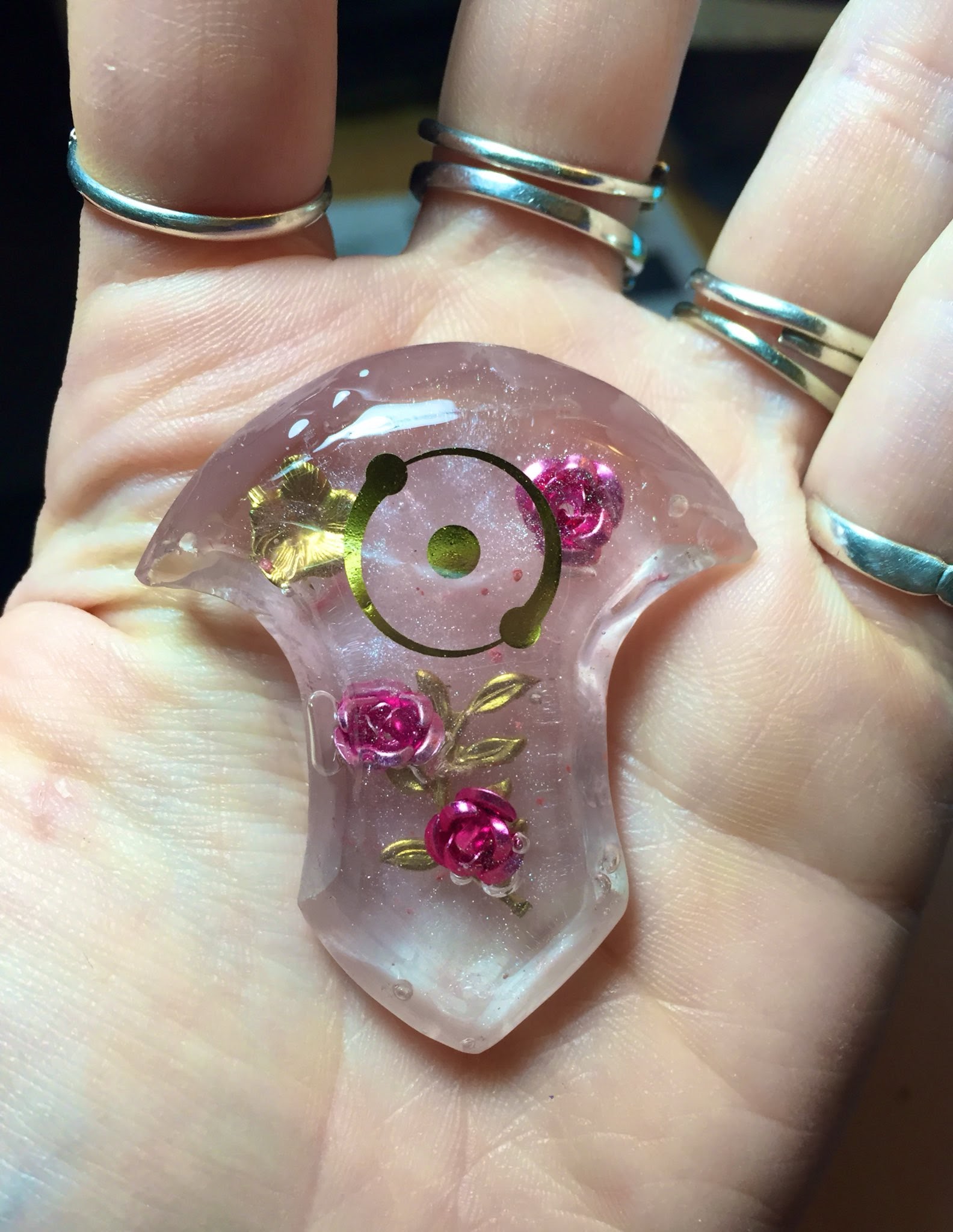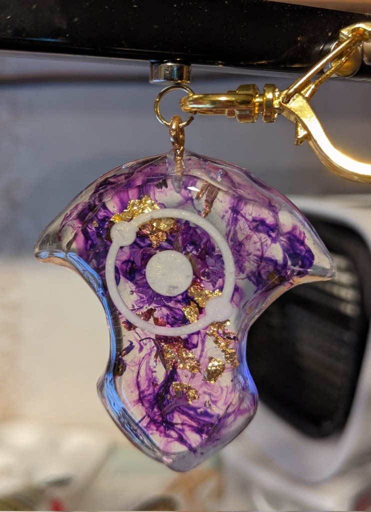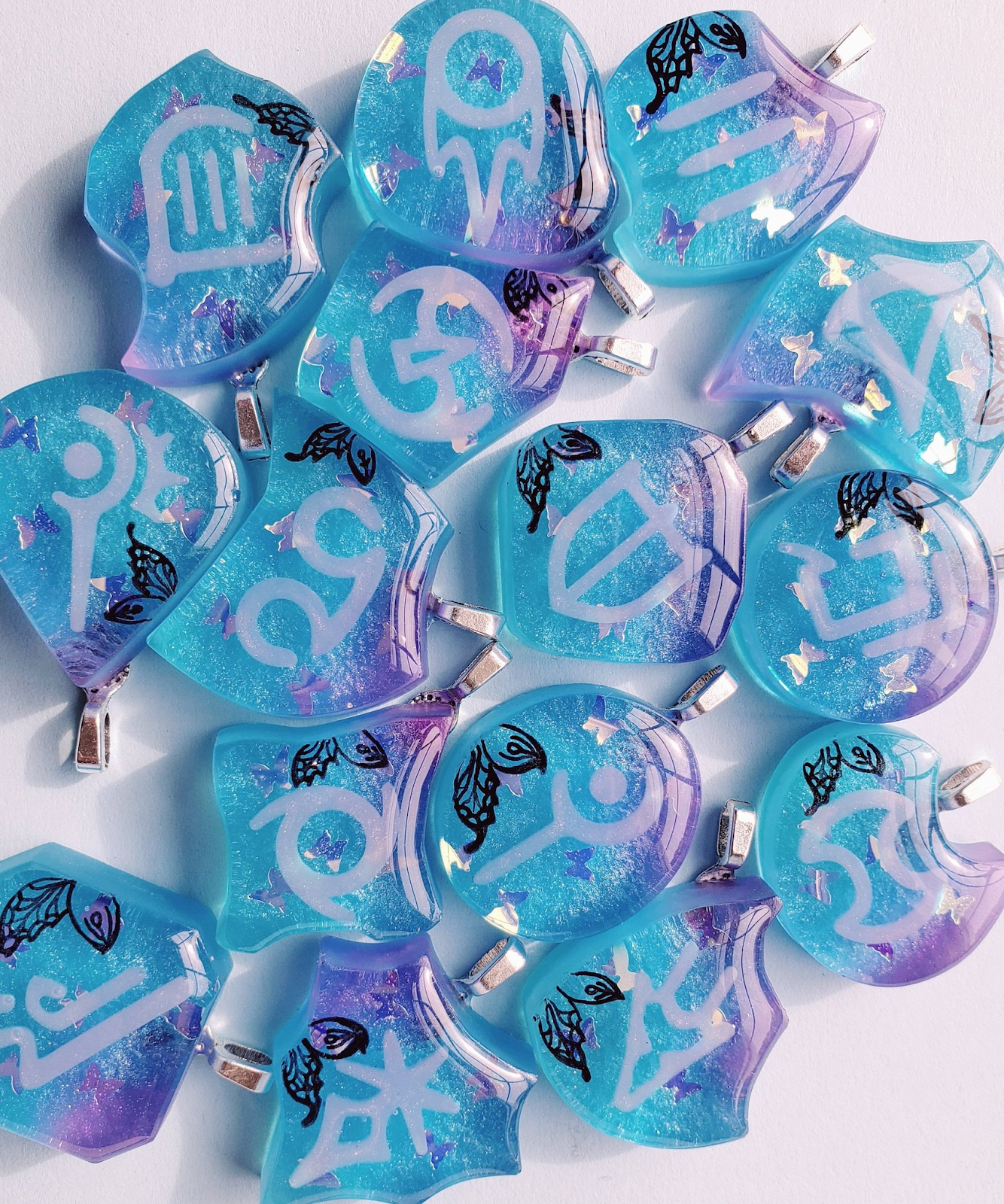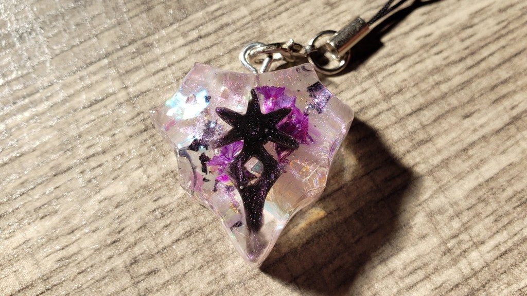 That community of creators and buyers alike is Justcharmy’s favorite aspect of casting soul crystals: “[The community is] a wonderful space and I’ve gotten wonderful concepts from bouncing ideas off of friends and chatting,” she affirmed. Much like other crafters, she is always looking for the next burst of inspiration to incorporate into her work, which is reflected in the wide array of options she offers in her custom orders: flowers, colored glass, holographic flakes, glitter and foil of all shades, and even glow in the dark resin!