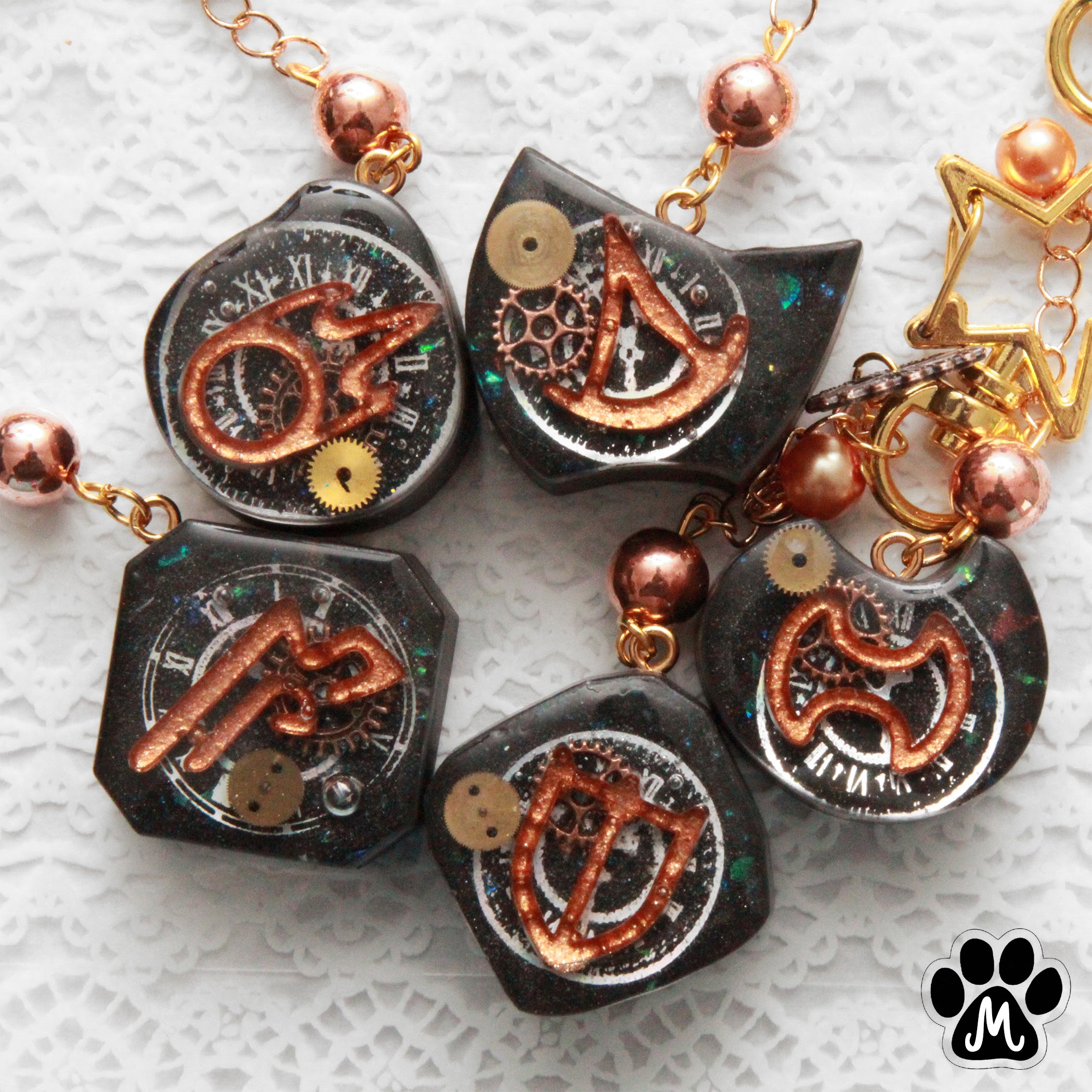 With a wide range of supplies and materials at their disposal, no two casters’ processes are exactly the same. Creating finished pieces exactly as they imagine requires countless hours of practice and experimentation. Alexei (Cookieboi1982 on Twitter), who was casting resin shaker charms and coasters before delving into FFXIV soul crystals, “learned about the beneficial use of rubbing alcohol being spritzed over top of a setting mold that would pop the bubbles.” The technique proved particularly useful for crystals, but like many discoveries while working with resin, Alexei’s innovation was borne from the difficulty of the materials themselves: “The initial mold I had for job stones was pretty dark so it was hard for me to be able to see all the bubbles at the bottom of the mold when I was pouring.” While a heat gun can also pop bubbles, he warned that “it can cause the silicone of the mold to heat up and then the resin will cure to it and that can ruin both the mold and the stone.” MiNah_creates, on the other hand, shared an extra tip from her own experience tackling the question of minimizing bubbles: “If you brush transparent powder (like baby powder) in your mold before pouring resin you rarely have any air bubbles on the bottom! . . . If you’re using dry pigments you can also brush them in your mold.”