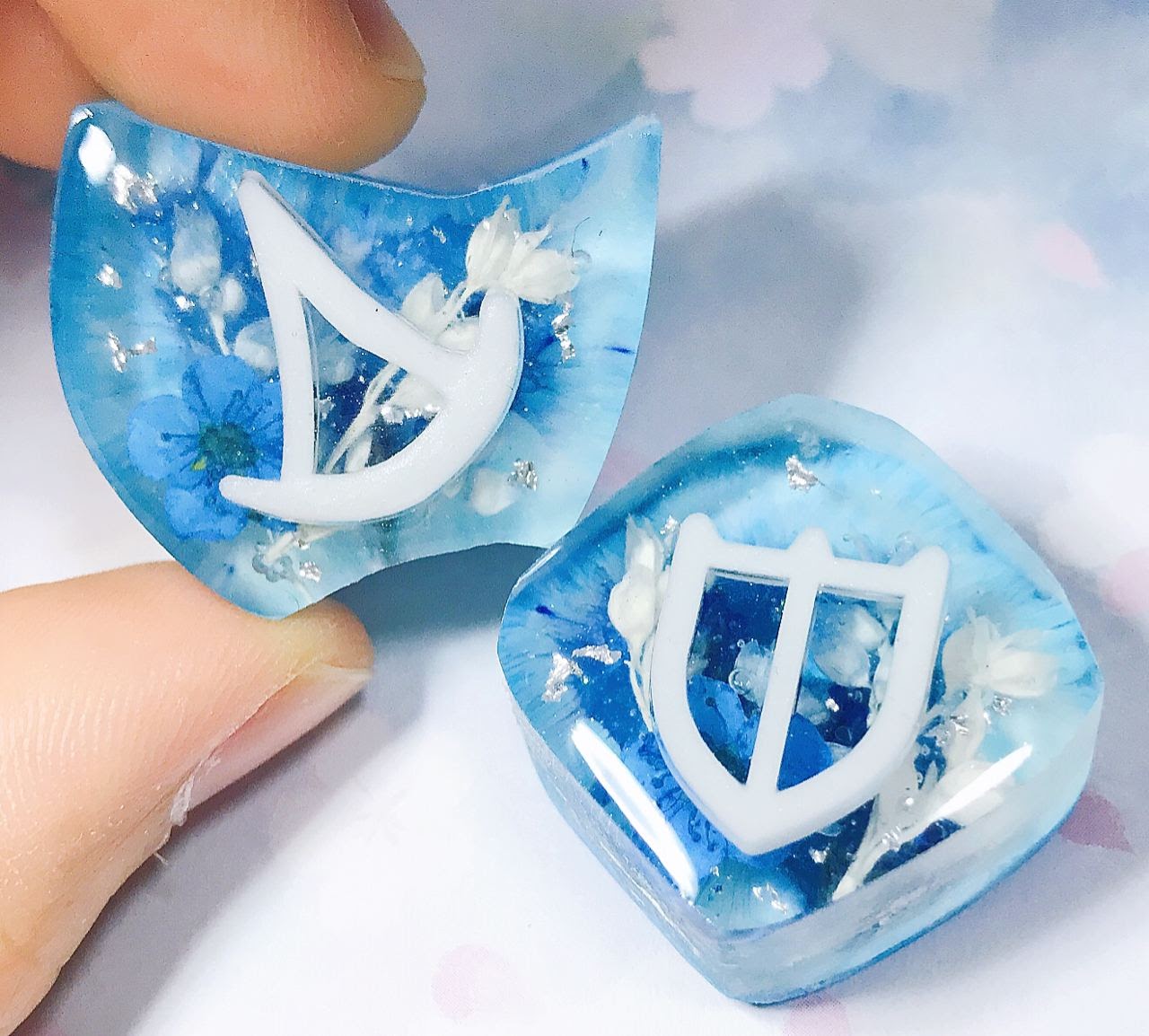 Soul crystals can take anywhere from several hours to several days to complete, depending on the type of resin, dyes, inclusions, and even the type of mold. Zazaa (Zaku709 on Twitter) shared that between her day job and her resin variety (AB resin, which requires twenty-four hours to harden), a single cast typically takes three days from beginning to completion, but that time can increase depending on other considerations: “As most of the stone designs are made with layering of different materials . . . more planning needs to be made so that the elements won’t overwhelm [or] block each other.”