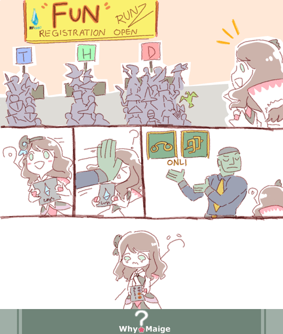 The Astrologian job patched in Heavensward, and WHMs back then were more unwanted than ever… “Why play White Mage?” I was asked this many times in-game. While I would answer with a smile, it made me angry! The meta made me angry!! Eventually, I’ve had enough!!! I rage-doodled a comic (the one involving a bard criticizing my DPS), showed it to some friends, and they all encouraged me to push through with the rage blog. (=w=) It took me a while before I found the courage to start my pages… I used “Why Maige” as an alias – a sort of mockery of the question tossed at me again and again by other players. After my blog’s launch, I guess it became a term among players – both people who disliked and liked White Mages. xD You could imagine how happy I am nowadays though – truly the FFXIV healer’s golden years. Gone are those primeval days where WHMs were told to only heal~ (UvU)