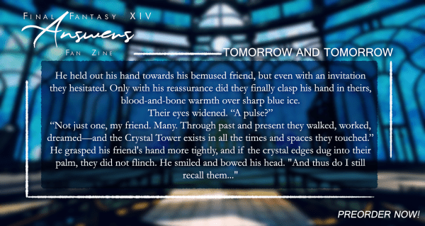 A short story written for the FFXIV fanzine "Answers." With the night restored, and a temporary sense of peace hanging over the First, the Crystal Exarch recalls the heroes of past, present, and future whose lives never touched, but whose spirits interlaced, to save the future-not-yet-written, the future of the constant companion by his side, the Warrior of Light and Darkness. One hundred years, one hundred threads, woven into this single moment, the pieces forming, finally, a finished tapestry.
