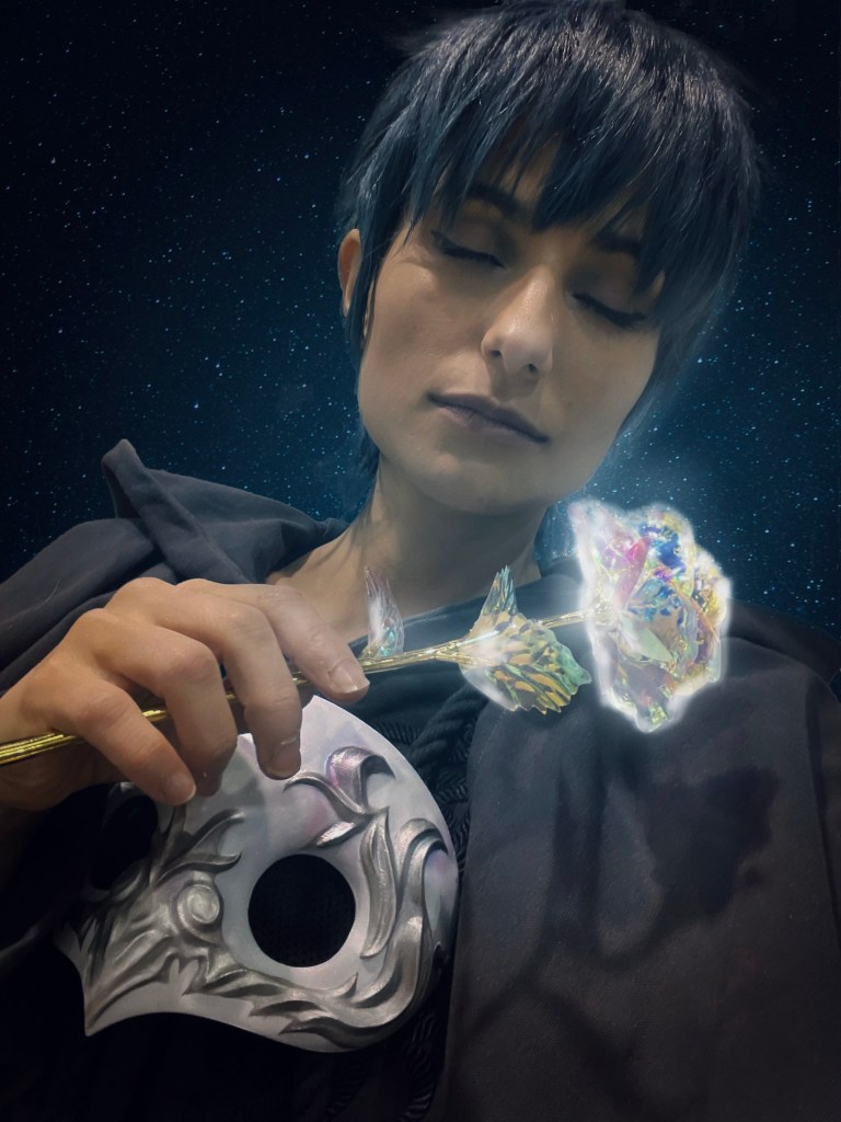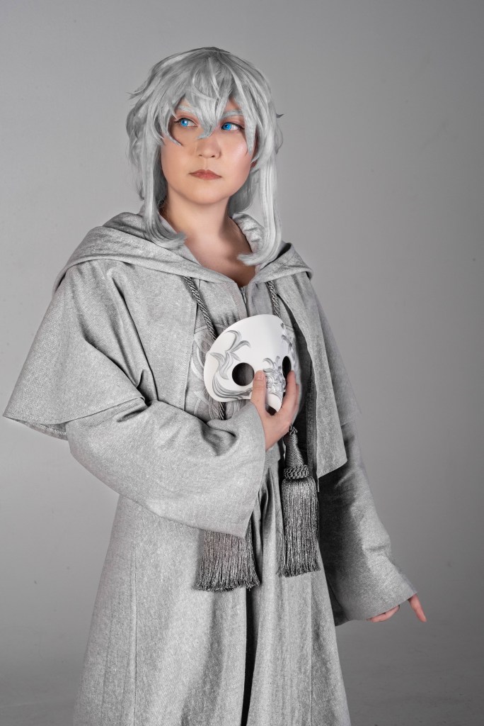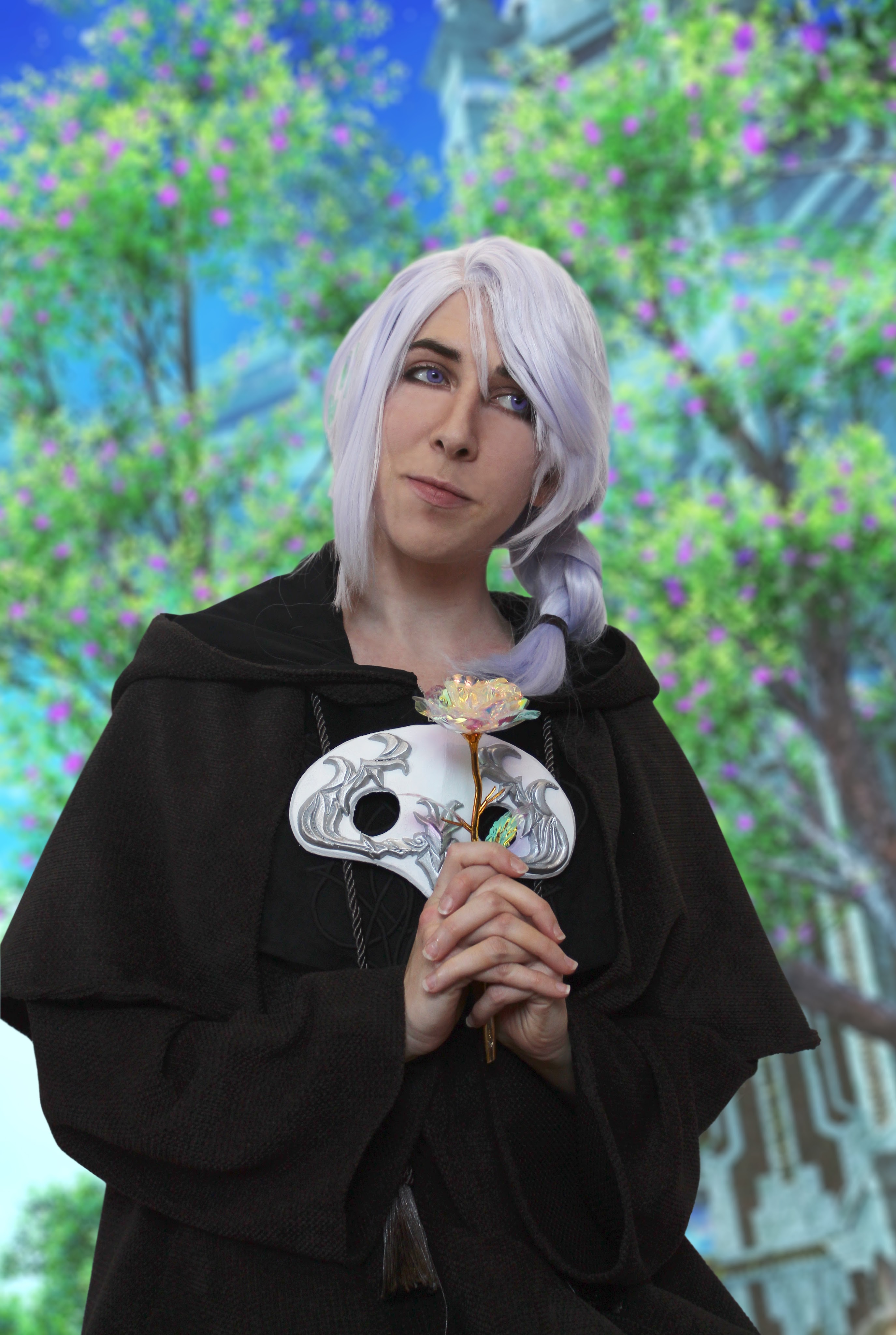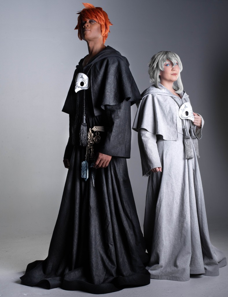 Joyce pointed out in her interview that the use of magnets within the robe’s tassels also allowed for the type of mask to be switched out at will, allowing one robe to be used for various characters. Once attachments were affixed, those who wanted the option of wearing the mask faced another challenge entirely. OiNoya opted for carving holes in the sides of her mask to insert an elastic band, but Kappa went in another direction entirely. For both his sophist and Emet-Selch masks, “kid’s sunglasses” were attached “to the inside of the masks via earth magnets,” with additional strength being added to Emet’s with “twist ties to accommodate” the heaviness of the mask. Cosplayers who constructed their masks from lightweight materials were able to opt for simpler and more easily accessible options. By creating her mask with resin, Em could attach “sanded down brass tab fasteners,” which are found in “any store that sells office supplies,” to the edges of the mask with superglue. The glued-on fasteners provided a firm attachment that could “just wrap around the tassels . . . and stay in place perfectly,” so that even “hiking up a mountain for a photoshoot” did not budge the mask at all. And if brass fasteners weren’t simple enough, Naaru’s use of EVA foam allowed for securing the mask to the tassels with mere safety pins, which served her purposes just fine and, as she herself jokes, was “absolutely disrespectful.” Most cosplayers, though, would argue that a job finished and done is always good enough, “disrespectful” or otherwise, as the polish of the finished product is still ultimately second to the pride and fun of wearing it.