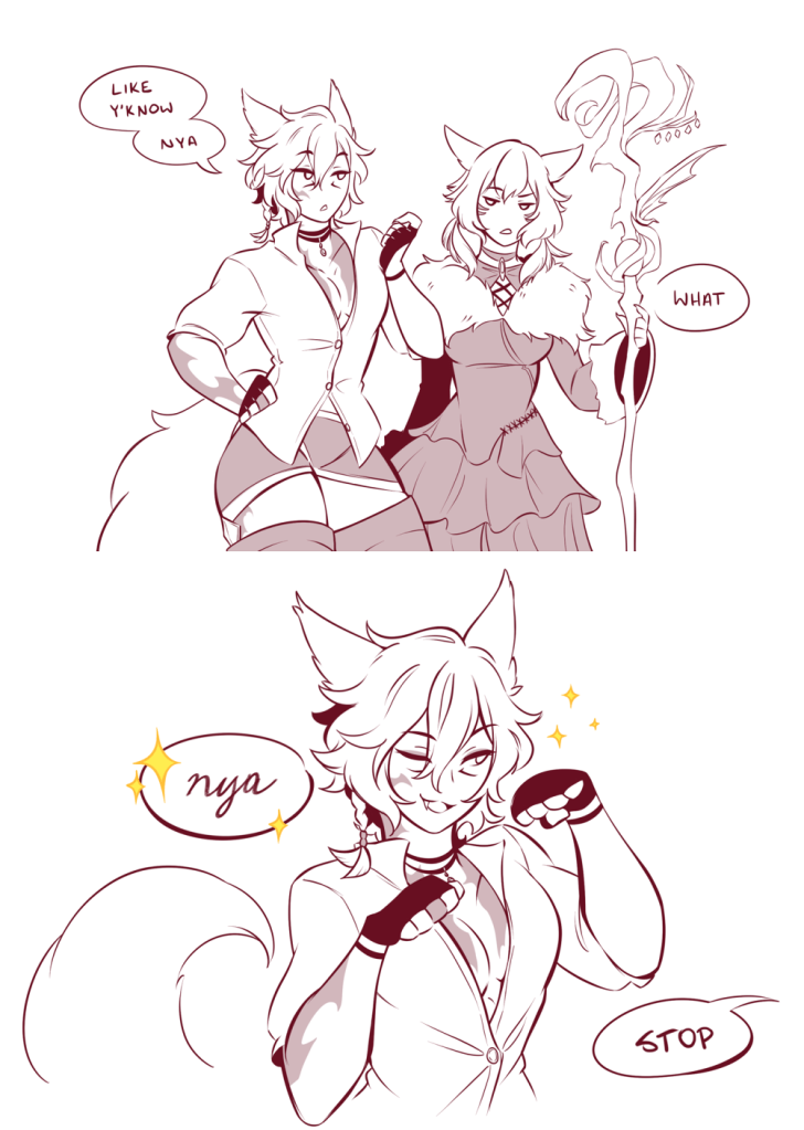 Well, I started my first free trial account back in 2014 on an old laptop that could BARELY run it; I couldn’t actually play much of it, but I was hooked on Arcanist from the beginning (I loved magic and pet classes in MMOs for as long as I can remember). It just had so much more to offer than all the free-to-play MMOs I was playing at the time, and the visual style was so unique! I made so many in-game friends, joined a free company that I loved, did savage content… I doodled my miqo’te here and there for it, up until Shadowbringers came out and inspired me to dig deeper and put my own spin on the story and build my WoL as more than just an avatar in a game. He quickly became his own character that I could actually call an OC, and my main one at that! I haven’t stopped drawing and iterating on my WoL ever since. The Crystal Exarch quickly became my favorite NPC, too.