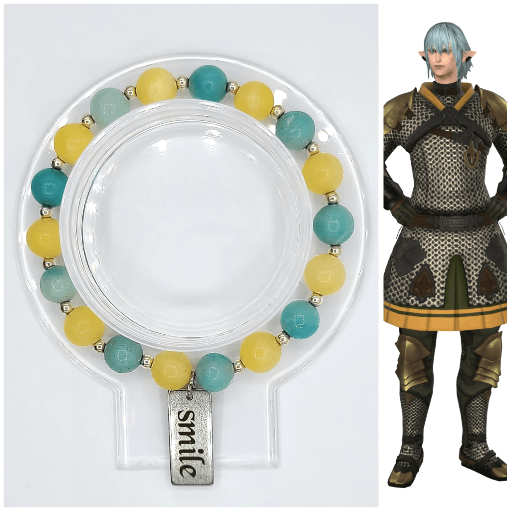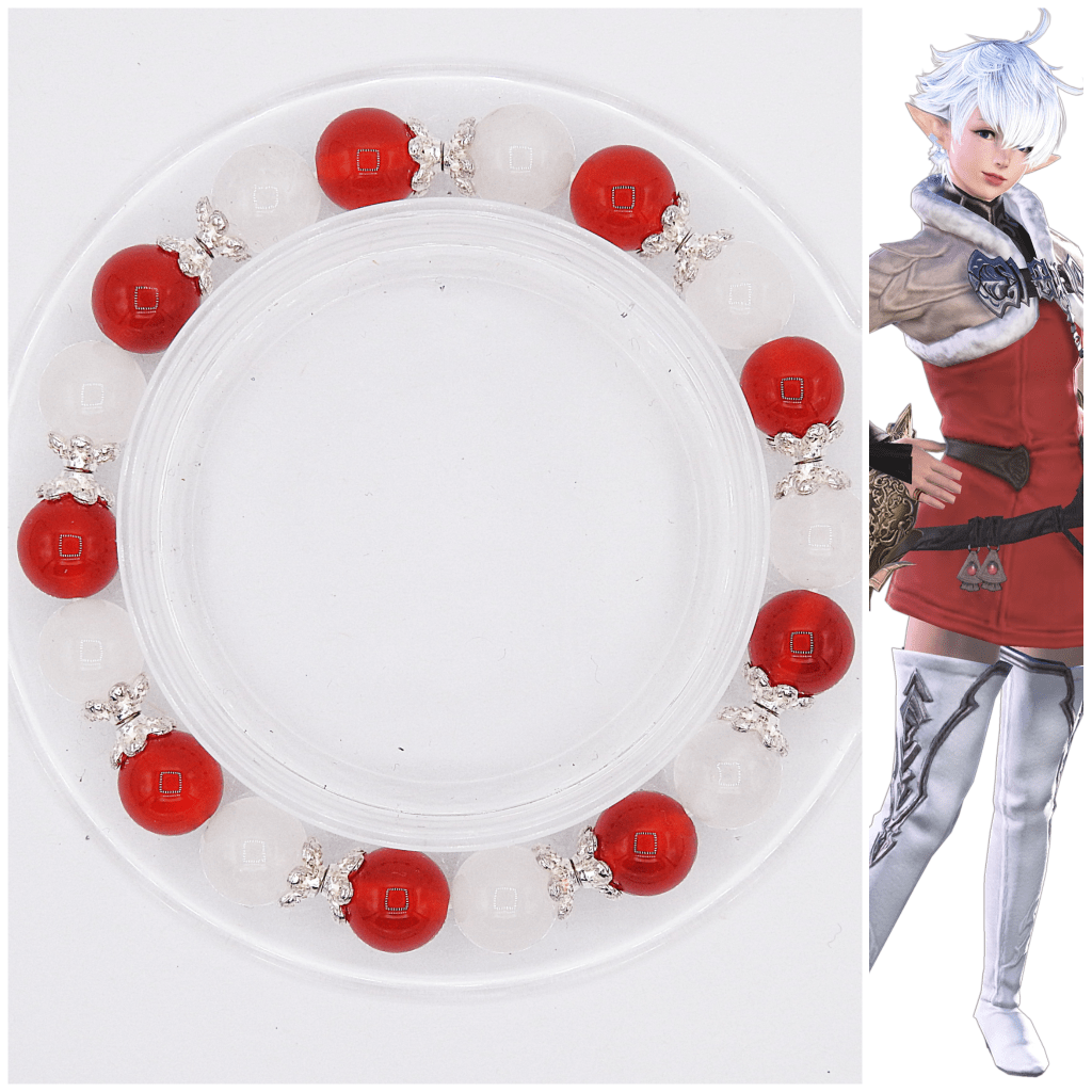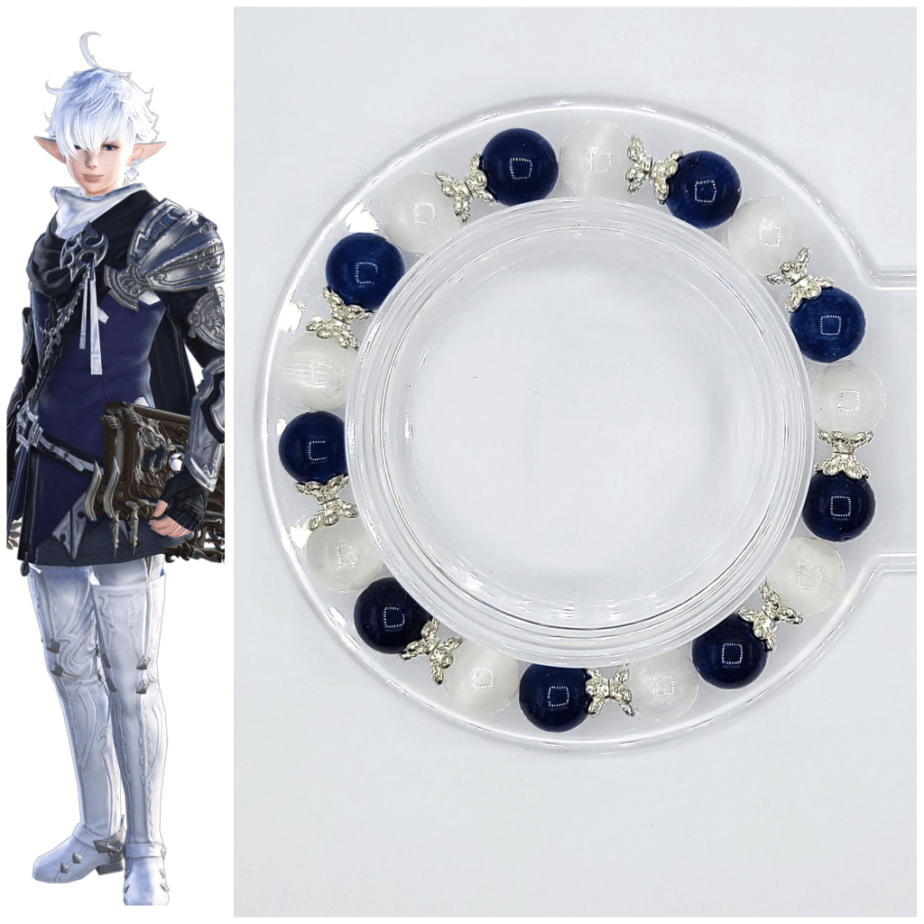 What is your process from first idea to final design when creating a bracelet? Also, I’m really interested in how you decide which stone to use when presented with different options that have similar colors. For example, for Alphinaud’s white stones, you picked Satin Spar, but for Alisaie you went with White Chalcedony, which are both white but subtly different from each other.